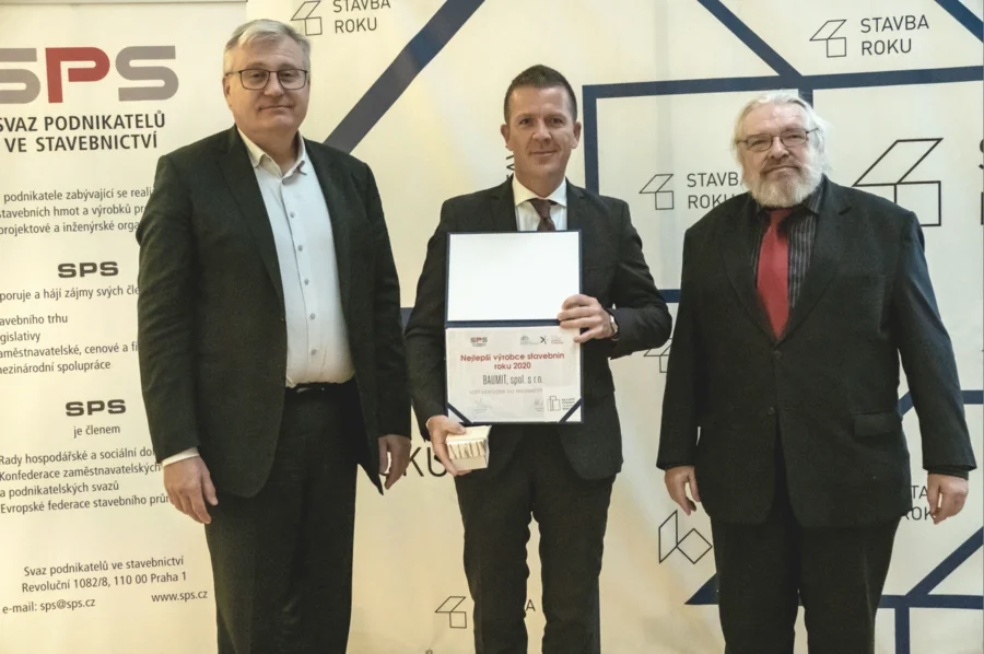 Ocenění za Baumit, spol. s r.o. převzal Ing. Martin Omelka (uprostřed) z rukou Ing. Jiřího Nouzy, prezidenta Svazu podnikatelů ve stavebnictví (vlevo) a Ing. Petra Serafína, ředitele odboru stavebnictví a stavebních hmot ministerstva průmyslu a obchodu ČR (vpravo).