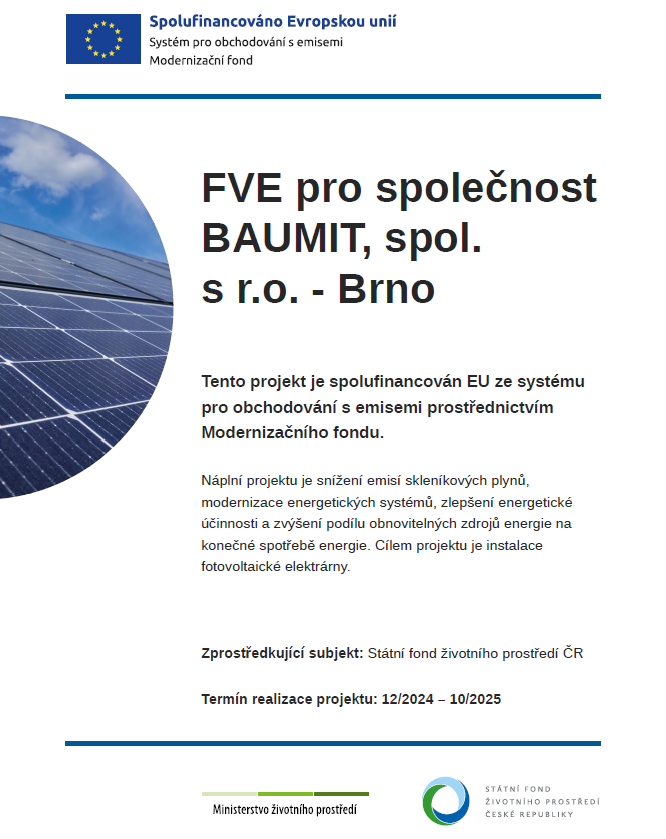 Společnost BAUMIT, spol. s r.o. pokračuje v naplňování své strategie udržitelného rozvoje a oznamuje realizaci rozšíření fotovoltaické elektrárny v areálu Modřice u Brna. Projekt je spolufinancován Evropskou unií prostřednictvím Systému pro obchodování s emisemi – Modernizační fond a přispívá k inovaci energetických systémů, zlepšení energetické účinnosti a zvýšení podílu obnovitelných zdrojů energie v rámci provozu společnosti.