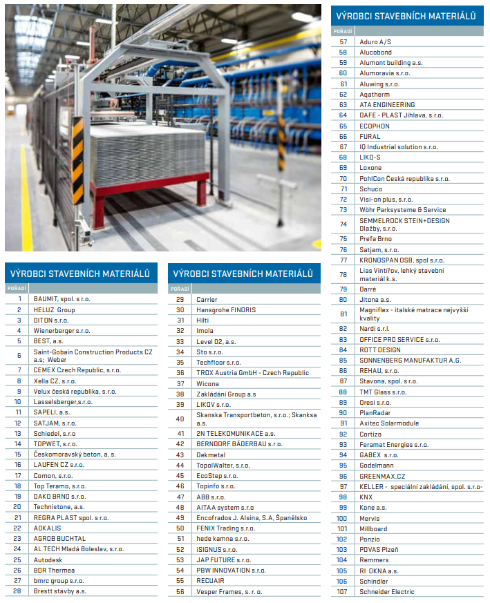 Společnost Baumit se opět umístila na prvním místě mezi více než stem výrobců a dodavatelů stavebních materiálů v letošním ratingu RABF. Na druhém místě se umístila společnost HELUZ Group a třetí příčku obsadila firma DITON. Baumit tak potvrdil své postavení lídra trhu a svou schopnost nabízet stále nové, spolehlivé a kvalitní stavební materiály s nízkým ekologickým dopadem.