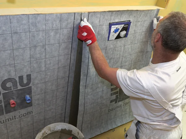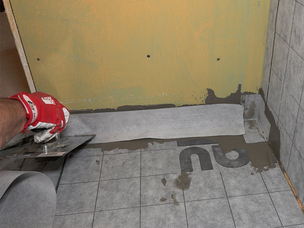 5) Do čerstvé vrstvy lepidla vložte těsnicí membránu Baumacol AquaSafe. Po celoplošném rozprostření ji důkladně přitlačte a odstraňte přebytečné lepidlo.