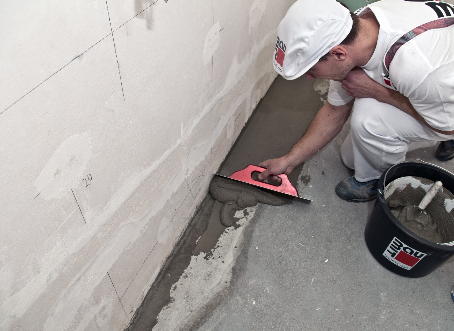 7) Do rohů po obvodu místnosti naneste hydroizolační stěrku Baumacol Protect a vložte hydroizolační rohový prvek Baumacol InCorner Plus.